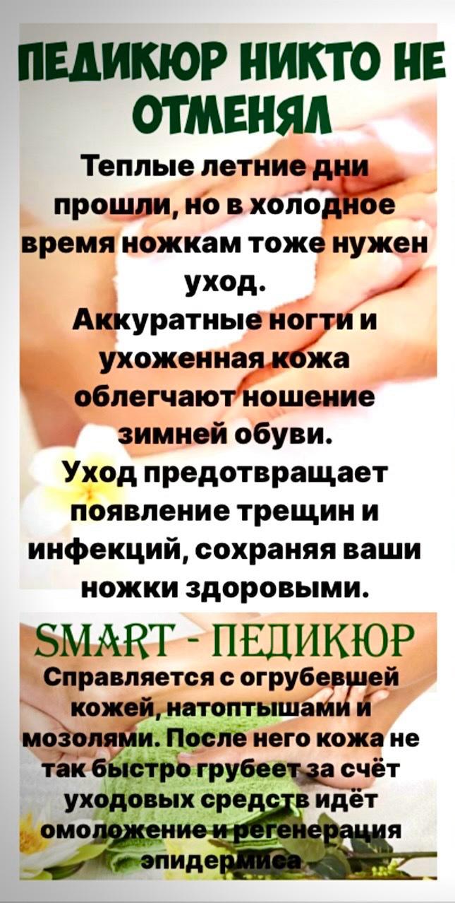 - Скидка 50% на SMART педикюр стоп или пальцев ног без покрытия (750 руб. вместо 1500 руб.)